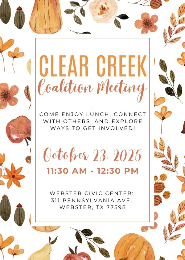 Join us for the first Clear Creek Coalition Meeting of the school year. Come enjoy lunch, connect with others, and learn how